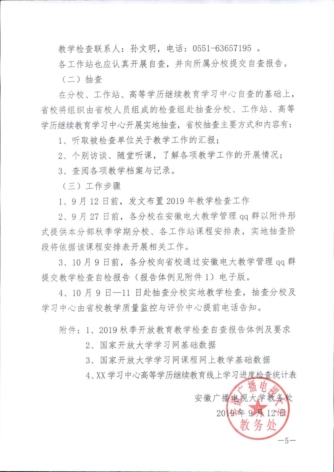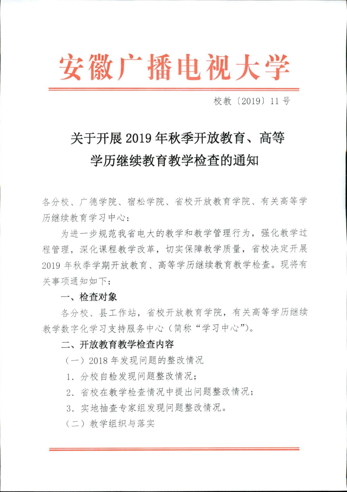 關(guān)于開(kāi)展2019年秋季開(kāi)放教育、高等學(xué)歷繼續(xù)教育教學(xué)檢查的通知(校教[2019]11號(hào))