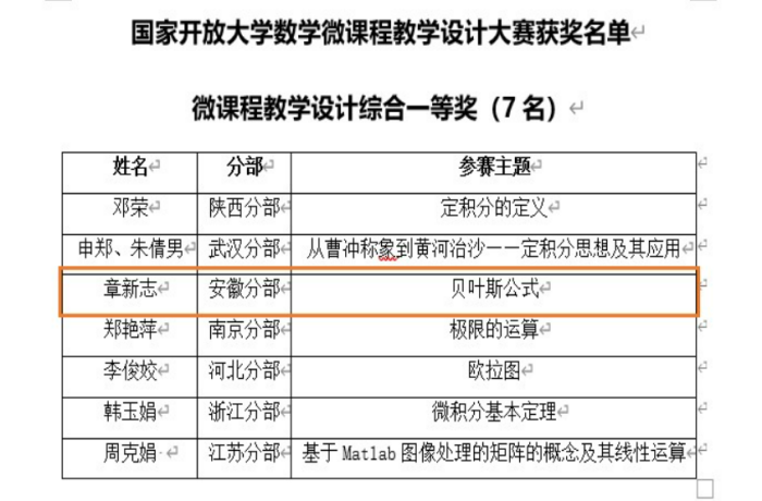 日前,國家開放大學(xué)數(shù)學(xué)微課程教學(xué)設(shè)計(jì)大賽結(jié)果公布,我校章新志老師的作品獲得教學(xué)設(shè)計(jì)綜合一等獎(jiǎng),同時(shí)獲最佳教學(xué)設(shè)計(jì)獎(jiǎng)和最具特色創(chuàng)意獎(jiǎng)。本次比賽共收到全國開放大學(xué)體系34個(gè)分部、學(xué)院推薦的65件優(yōu)秀作品。經(jīng)過個(gè)人申報(bào)、分部初賽、總部初選、決賽等環(huán)節(jié),最終評(píng)選出微課程教學(xué)設(shè)計(jì)綜合一等獎(jiǎng)7名,微課程教學(xué)設(shè)計(jì)綜合二等獎(jiǎng)13名,微課程教學(xué)設(shè)計(jì)綜合三等獎(jiǎng)21名,最佳教學(xué)設(shè)計(jì)獎(jiǎng)2名,最具特色創(chuàng)意獎(jiǎng)2名。